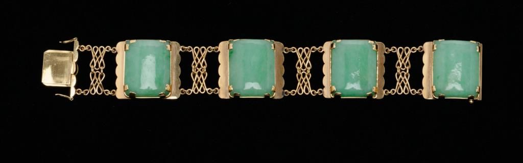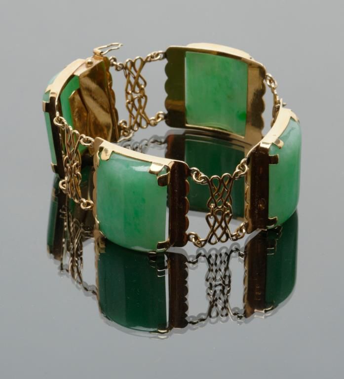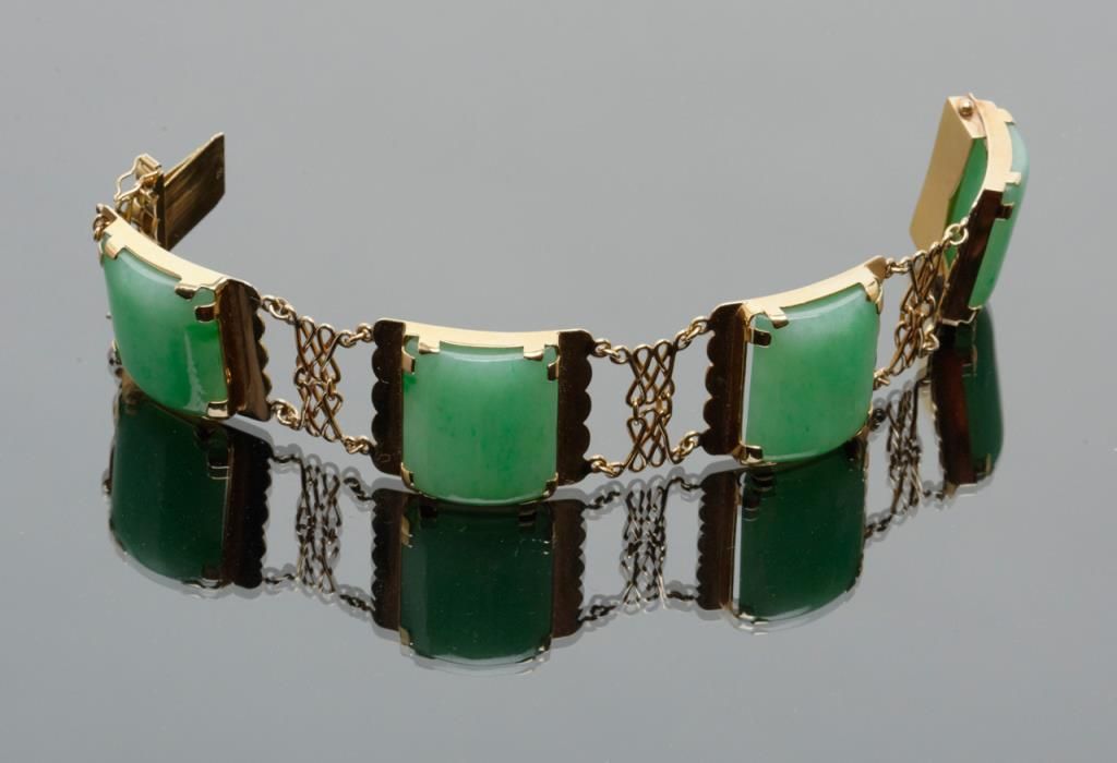 One fine quality retro bracelet made in 18k yellow gold dated circa 1940 set with 28mm x 23mm fine qualty natural Jadeite untreated. Est.: $7,500-$15,000.