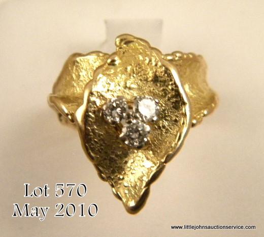 One hand crafted Ladies ring in 14k yellow gold set with 3 diamonds weighing approx. 0.18ct. Gold weight-7.8gm. Est. $750-$1,200.