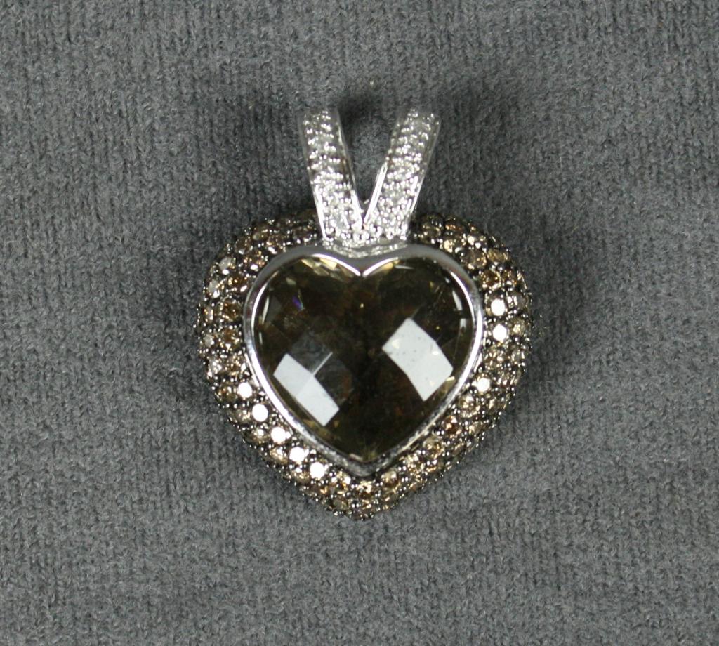 One heart shaped pendant made in 14kt white  gold and set with a heart shaped checkered  cut smokey topaz (16.8ct) and black and white  diamonds (2.98ct). Est. $3,000-$4,000.