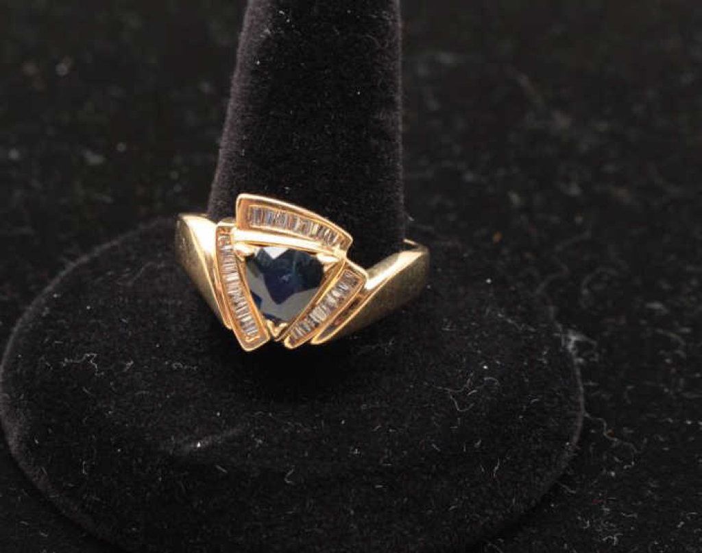 trilliant cut sapphire wt approx 1.75 ct and diamond 21 baguettes. Est.: $1,000 -$2,000.