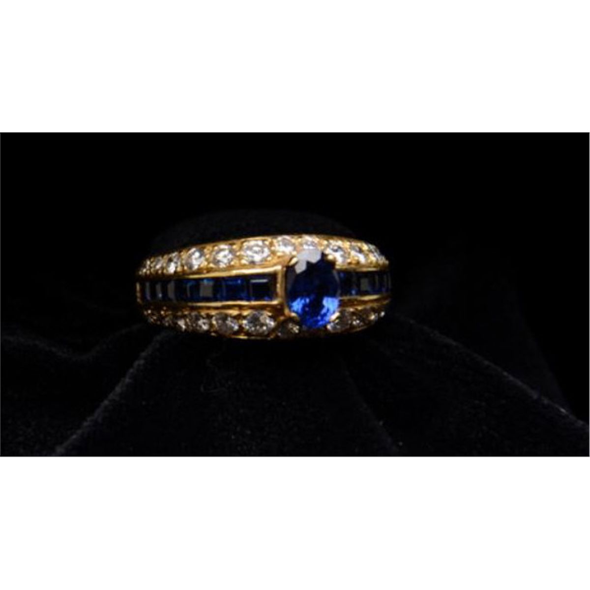 One ladies ring in 18k yellow gold set with fine oval sapphire and baguette sapphire and round diamond accent. Est.: $800-$1,600