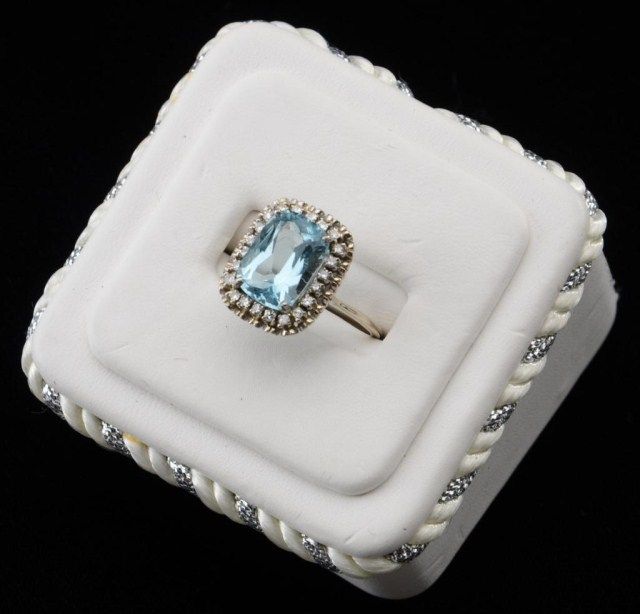 One ladies ring made in 14k white gold set with an emerald cut aquamarine weighing approx. 5ct and 23 diamonds weighing 0.70ct. Est.: $1,000-$1,500.