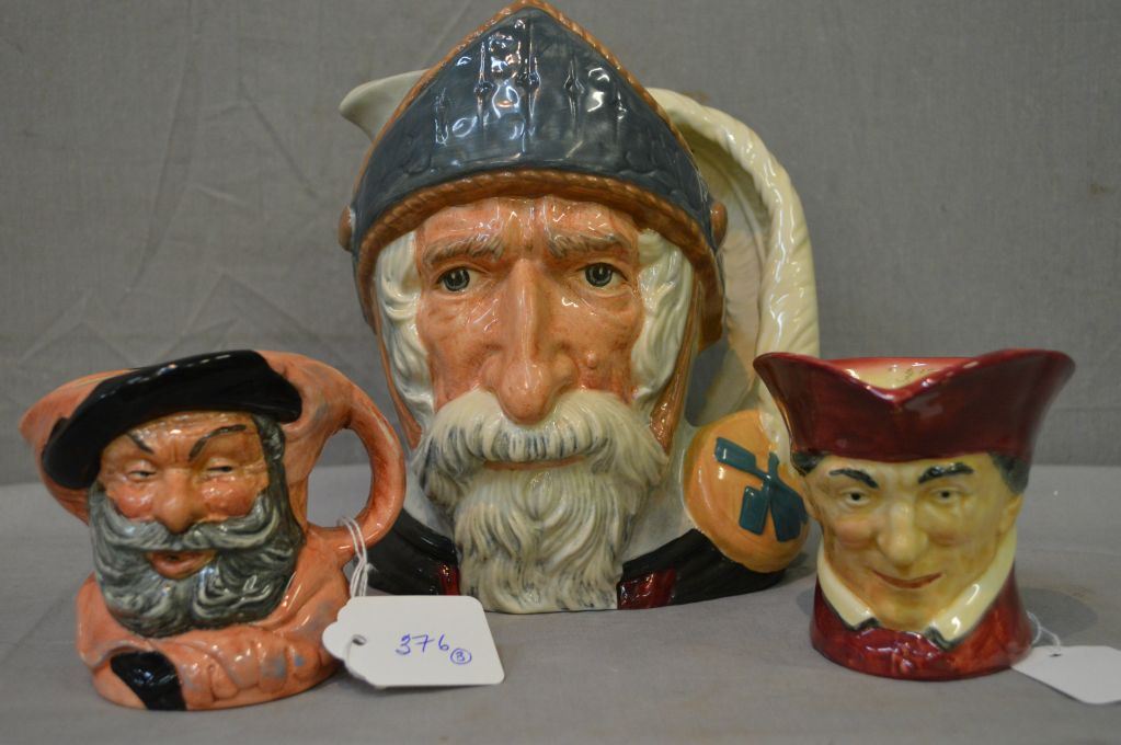 One large Royal Doulton character jug Don Quixote D6455 and two small character jugs including Falstaff D6385 and Cardinal
