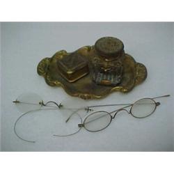 One lot including desk tray with inkwell and stamp box, and two pair of spectacles, brass tray with raised swirl rim decoration, with attached square stamp box with removable lid engraved "Stamps", and an attached fitting with glass and brass inkwell with hinged lid; and two pair of spectacles with gold filled rims and fittings, all early 20th C.