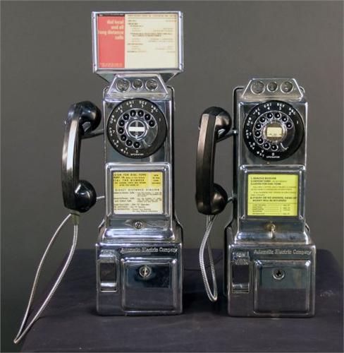 One lot of 2 pay telephones in chrome with keys in working order 40's and 50's