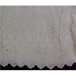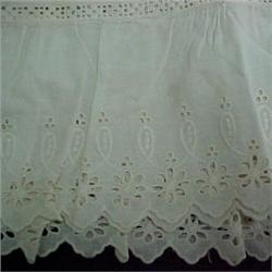 One lot of Victorian white undergarments includes full slip with pleating and crocheted lace edge; bloomers with ruffled eyelet edge; batiste apron with embroidered decoration; batiste slip with tiered construction; slip with eyelet lace edging and two early hoops for skirts, all pieces have very slight damage and need laundering Estimate 140/250