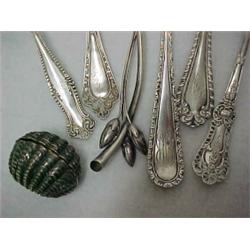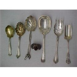 One lot of six sterling silver flatware serving pieces and a sterling silver nutmeg shaker including Alvin Sterling large Cold Meat Fork; a sterling Ice Spoon with gold wash in bowl, marked on back Edward Rouse, and initialed on handle (no maker's mark); Towle Silver- smith's Gravy Ladle with gold wash on bowl "Canterbury" (1893) initialed on handle; a leaf shaped sterling silver spoon with stem and bud handle, Fleur de Lis maker's mark on bottom of bowl and initialed on bottom of bowl; a Gorham sterling soup ladle initialed on handle; a Watson Co. sterling Cold Meat Fork With gold wash on prongs, initialed on handle; and an English sterling nutmeg shaker in hinged clamshell shape with hinged shaker, hall- marked