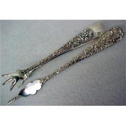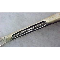 One lot of sterling silver table articles including a pair of Fisher sterling silver salt cellars, initialed, 2.2 oz. with cobalt glass liners; two sterling spoons, one marked Wallace, .2 oz.; Steiff sterling sugar tongs 1 oz.; a Steiff sterling pick .8 oz.; two Wallace footed clamshell dishes 3 1/2", 1.6 oz. Estimate 60/100