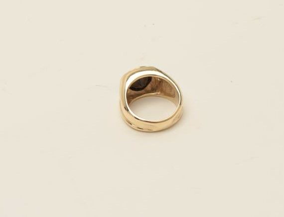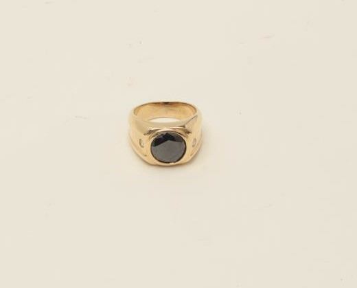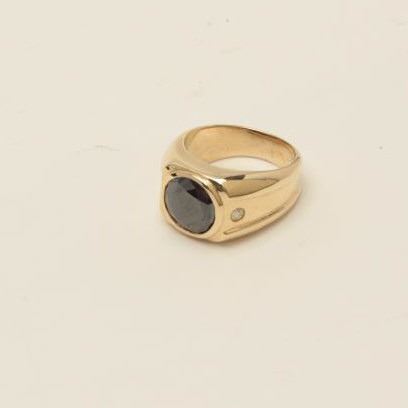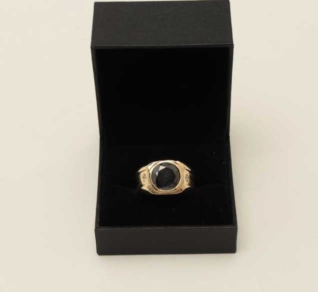 One men’s ring in 14k yellow gold set with a 5.7ct round brilliant cut black diamond and 2 side white diamonds weighing 0.25ct. EST.$3,000-3,500
