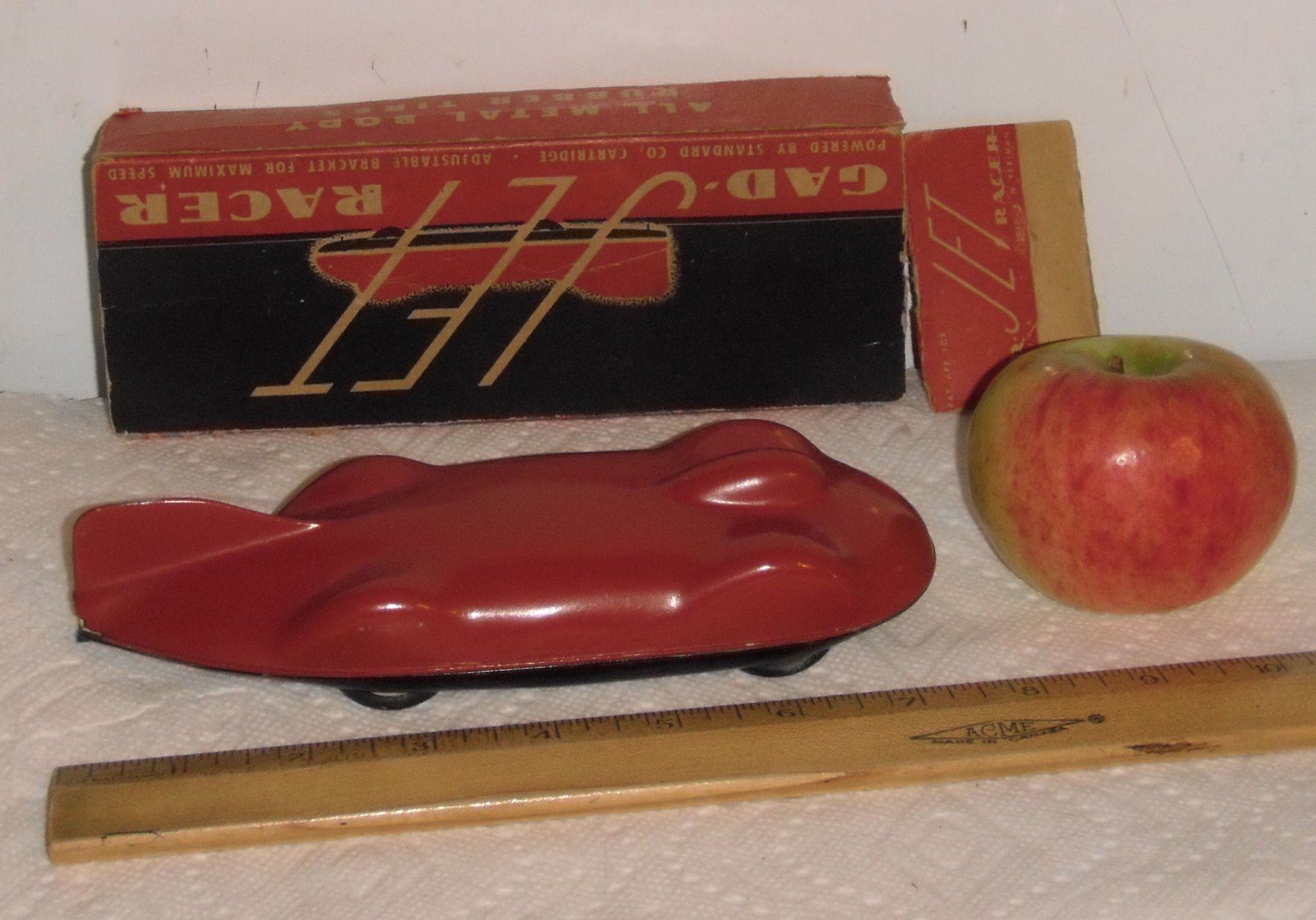 NOTE : A new concept as the Designer CREATED A MODEL : Jet great red racer rare toy Los Angeles sales California tin car very old near mint with as is box with one end for excellent collectors !!!