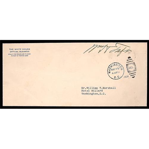 <Our item number 141075><B>Taft, William H.</B> Superb signature ("Wm H Taft") on a White House envelope addressed to Mr. William T. Marshall at the Hotel Willard In Washington, D.C., with a postmark of Washington, D.C. The dark, bold signature is at upper right. The postmark date is 1928, which is after Taft's presidency (1909-13). This is one of only three known Taft free franks. Fine; slight soiling. Rare. <BR>Estimated Value $4,000 - 6,000. <I><BR>Ex collection of William R. Coleman.</I> <BR><BR>Our item number 141075<BR><IMAGES><P ALIGN="CENTER"><IMG SRC="http://www.goldbergcoins.net/liveauction/49jpegs/141075.jpg"> </P></IMAGES>