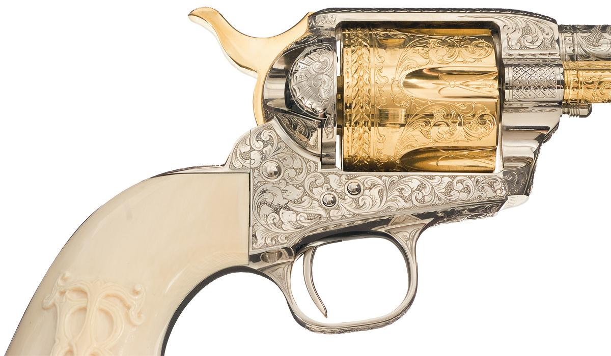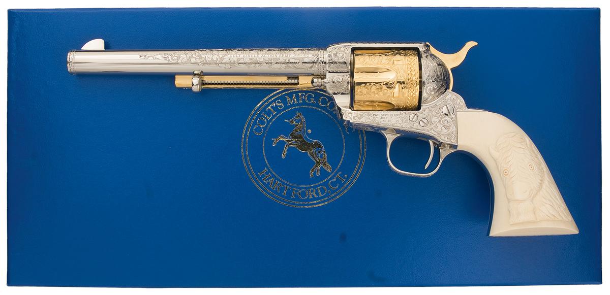 This beautiful revolver is an exact recreation of a Colt Single Action revolver commissioned for Teddy Roosevelt. This revolver was engraved by Master Engraver Dennis Kies and features floral scroll and stippled background engraving on the sides of the barrel, frame, cylinder flats and forward portion of the trigger guard. The sides of the top strap have a feather design, a shell design on the loading gate and geometric designs on the backstrap and trigger guard with double scallop bordering. The left side recoil shield has a fancy intertwined "TR". The ejector housing, cylinder and hammer are gold plated, and the remaining parts are nickel. The top of the barrel is marked with the one line address bordered by a decorative line design, the left side is marked "COLT SINGLE ACTION ARMY .44-40" in a panel and the left side of the frame is marked with the three line, three patent dates. The revolver is fitted with a one piece ivory grip with a relief carved buffalo head on the left side and relief carved fancy intertwined "TR" on the right. The consignors notes state that while he was at a Colt Collector's Convention he was told by Joseph Canali and Dennis Kies that this revolver is identical to one given to Tom Selleck (the only difference "TS" on the grip instead of "TR") by the Colt Collector's Association in appreciation for the work/narration that he did when the Colt Show was in the Buffalo Bill Museum in Jackson, Wyoming and that neither recall ever seeing another Teddy Roosevelt ordered through the Colt Custom Shop. Complete with a blue Colt Custom Shop box and plain white outer sleeve numbered to the gun.