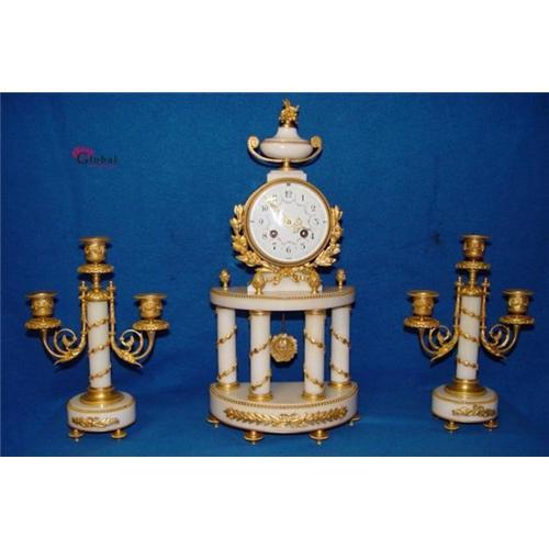 SIMPLY EXQUISITE!!! JUST TAKE A MOMENT TO TAKE IN THE BEAUTY OF THIS FABULOUS ANTIQUE EMPIRE CLOCK SET!!We are very excited to offer you this amazing gilt clock set that dates from the third quarter of the 19th C. (c. 1870). This is the most wonderful clock set you will ever find!The clock set is made of the finest Carrara marble decorated with bronze gilt ornaments.The columns of the clock and candle sticks are decorated with fine guirlandes.Good running and striking condition with 8 days going work and the 1/1 and 1/2 hours striking on a silvered bell. This fantastic clock set came out a very fine estate in the South of France near Marseille.If you want a very special clock set for your exculusive collection, or a very special clock set that no one other can buy at any time that´s the right clock for you!!The dimensions are:(Clock), Height: 18 Inches,Width: 8,5 Inches and Depth 4,5 Inches.(Candlesticks), Height:11 Inches,Width: 8 Inches and Depth 4 Inches.Regarding shipping we will pack the clock set in a wooden crate so you will receive it without any damage. Shippingscosts to the U.S.A. are 185 $ US. After payment you will receive the clock set in about 4 or 5 days.If you have an eye for an unique piece that will give your home that one of a kind look,this is it ! Thank you for looking this marvelous clock set.Sincerely, Wil Tegenbosch, Global Antiques Holland