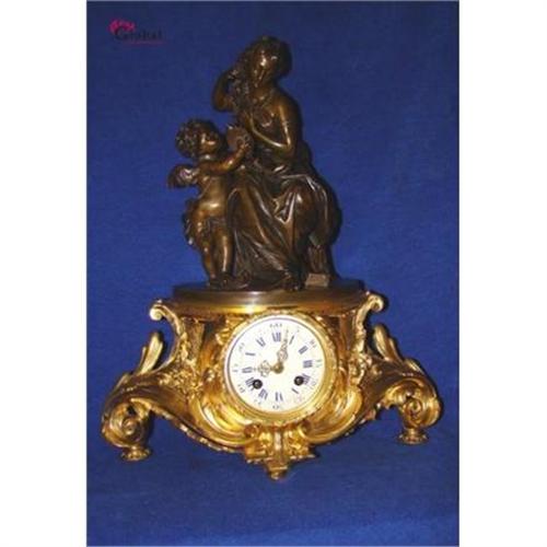 Important and Exclusive Bronze Gilt Mantel Clock !! SIMPLY STUNNING!!We are very excited to offer you this amazing bronze gilted mantel clock that dates from the third quarter of the 19th C. (c. 1870). This is the most wonderful mantel clock you will ever find!On top of the clock is a representation of a bronze cherub with a beautiful woman who makes up her hair. This group has a gorgeous dark brown patina and is signed with "Salmson".Jean Jules Salmson,born in Paris, was a very famous sculptor in France at that time.The bronze glited base is in perfect condition.We were lucky to acquire this clock from a lovely Private estate in the South of France near Cannes!The porcelain dial has blue arabic and romain numbers and the gilted hands are fantastic!Good running and striking condition with 8 days going work and the 1/1 and 1/2 hours striking on a silvered bell.The movement is stamped with: "SF and JD-11067".The style of the unique mantel clock is Napoleon III.This amazing mantel clock is one of the most unique and fabulous clocks we have seen in quite some time! The dimensions are: Height: 16 Inches ,Width: 13,5 Inches and Depth: 7 Inches.Regarding shipping we will pack the clock in a wooden box so you will receive it in perfect condition. Shippingscosts to the U.S.A. are 180 US$. After payment you will receive the clock in about 5 days. This is a very nice clock for the collector or someone wanting an unusual bronze gilted mantel clock that no one else has!!Thank you for looking ...