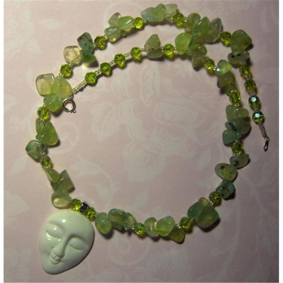 One of a kind, hand crafted natural Prehenite Designer Necklace, ght Lime Green, natural Prehnite semi-precious stone necklace with finely carved ox-bone pendant, Accents of faceted matching colored crystals, Necklace Length is 18.5 inches, Ox Bone pendant length is 1 3/8inches, mwf1844
