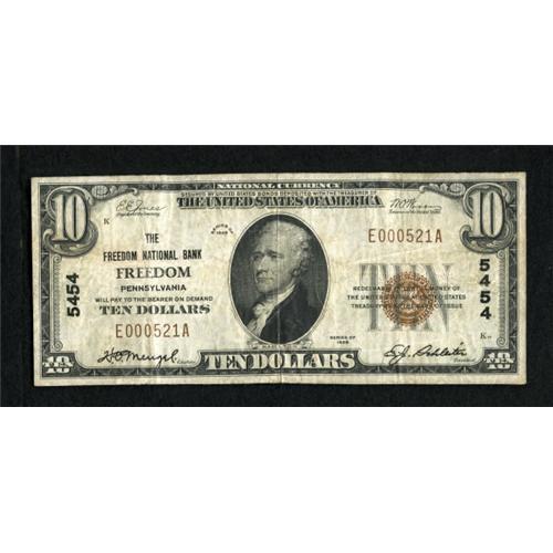 <B>Freedom, PA</B></I> - $10 1929 Ty. 1 <B>The Freedom NB</B></I> Ch. # 5454<BR> One of our fellow catalogers would be quick to point out the repeater charter number, though this cataloger would rather point out the patriotic town name to explain the appeal of this note. Only two banks issued notes in Freedom and the other is largely unattainable with only three notes known. <B>Very Fine.</B></I><BR><BR><b>Shipping:</b> Coins & Currency (<a target="_blank" href="http://www.heritageauctions.com/common/shipping.php">view shipping information</a>)
