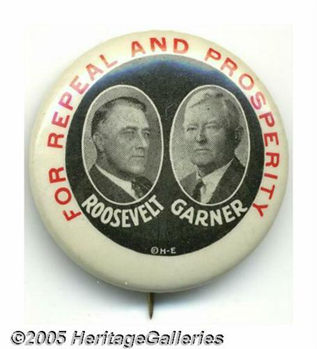 <B>One of the Best Franklin Roosevelt - John Garner Jugates</B></I> This great 1 1/4" button is clearly from 1932, as it calls for the repeal of Prohibition, which was accomplished shortly after FDR took office. Quite rare: this is the first example we have ever handled. Beautiful condition. Lot:263
