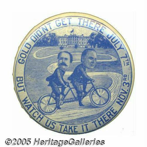 <B>One of the Greatest Political "Cartoon" Button Designs, and the Hake Book Plate Specimen</B></I> This delightful 1896 variety, showing William McKinley and Garret Hobart peddling a bicycle-built-for-two up the drive to the White House, is exceeded in its charm only by its extreme rarity; probably fewer than ten are known, and a number of those have varying degrees of condition problems. This 1 1/4" beauty is perfectly centered and very choice, almost certainly the finest known example. Condition and distinguished provenance combine to make this one of the most exciting political buttons we have ever offered. Lot:260
