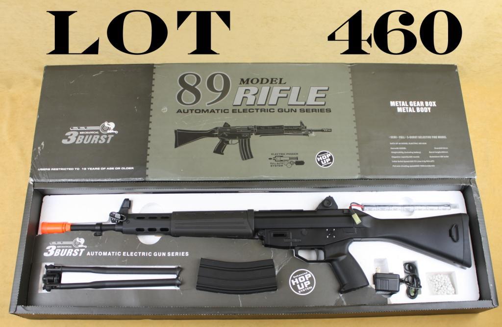 One of the “Kings” of airsoft rifles; a Chinese Model 89 electric replica of an H&K semi-automatic rifle in overall excellent condition showing little use or handling in factory cardboard box with bipod, instruction manual and package of plastic pellets; overall length is approx. 36”, 6mm caliber. Est.: $100-$300.