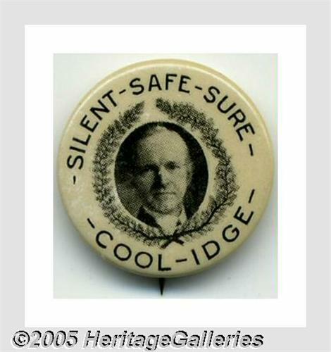 <B>One of the Most Sought-after Calvin Coolidge Button Varieties</B></I> Striking design and super slogan, "Silent-Safe-Sure-Cool-idge," combine with rarity to make this 7/8" button a prize indeed. While there are two variants, this has always been considered the more desirable. Beautiful condition. Lot:262