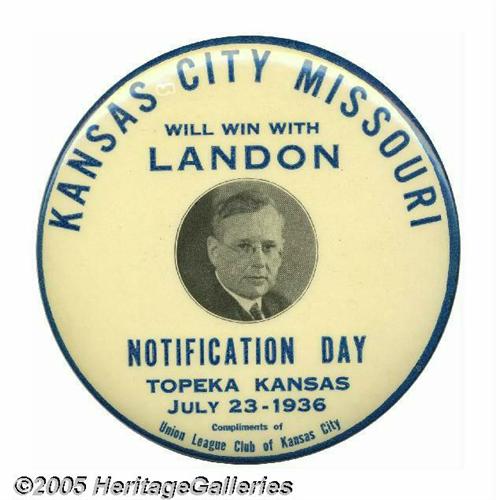 <B>One of the Top Alf Landon Portrait Buttons</B></I> This massive 3 1/2" button belongs at the center of any Landon display! Popular "notification day" subject: from the turn of the century through 1940, it was the custom for the Presidential candidates to remain aloof from the proceedings of the nomination conventions, so formal delegations would be sent to "notify" the candidate of his selection. These events were typically turned into giant political rallies which often occasioned the manufacture of great one-day-event buttons and badges. This is one of the nicest of that genre, and especially so as there are so few Landon button varieties with any "pizzazz." Excellent condition. Lot:263