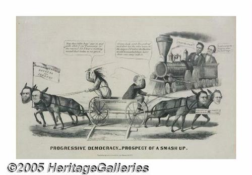 <B>One of the Very Best Varieties of 1860 Currier Political Cartoon Prints</B></I> Marvelous content! The railroad tracks are blocked by a wagon, pulling in opposite directions. One team of mules, with heads of <B>Douglas and Johnson,</B></I> sports a "National Democratic Nomination" flag. The other, with heads of <B>Breckinridge and Lane,</B></I> with sign marked "Democratic National Nomination," are driven by "Old Buck" Buchanan, who declares "I'd rather the Machine would be smashed than let them (Douglas and Johnson) run away with it." Meanwhile, a powerful locomotive carrying <B>Lincoln and Hamlin</B></I> is bearing down on the stalled Democratic wagon. Exceptional clean, crisp condition, framed under glass. 17.5" x 11.5", 24" x 19" as framed. Lot:257