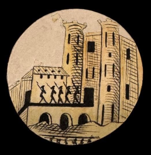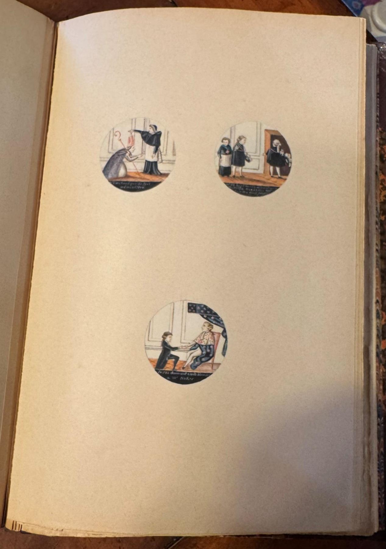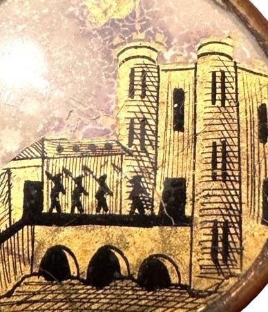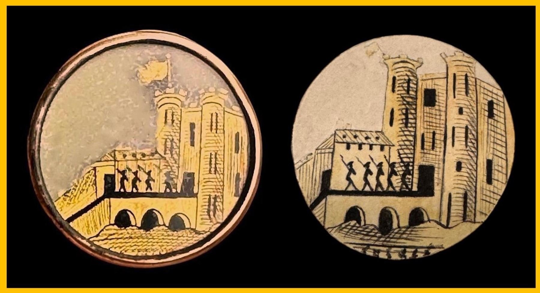 The button is hand painted in what is known as the French technique of Eglomise work which is a technique by which the artist would reverse painted the glass in actual fold leaf and then take a fine needle like tool and outline the design in the gold leaf they desired. After that they would painted black over the entire reverse of the glass giving the effect that this Eglomise design creates. When this button arrived for us to sell in our auction I was sure I was familiar with the scene and thought it must be in the Big Book of Buttons, but no it wasn?t, so I thought maybe Tender Buttons book or my grandmothers book, The Colorful World of Buttons, but it was in neither. At that point I was ready to give up, but the next morning it suddenly came to me where I had seen this image before. I have a very rare artist portfolio book of paintings on paper from a French artist in the 18th century that I inherited from my grandfather George Ertell and lo and behold the hand painted image was in the book (as pictured here next to the button). Some of you m ay recall seeing this book on display at the NBS show in Appleton in 2024 in the Friday night program on French buttons. The painting in the book is on parchment but was obviously the artists rendering used to create this rare Eglomise example. NOTE: You are bidding on the button, and it does NOT include the artist rendering in the book, but if you are the lucky winner of this very RARE button please let me know and I will send along a color copy of the rendering in the book for you.