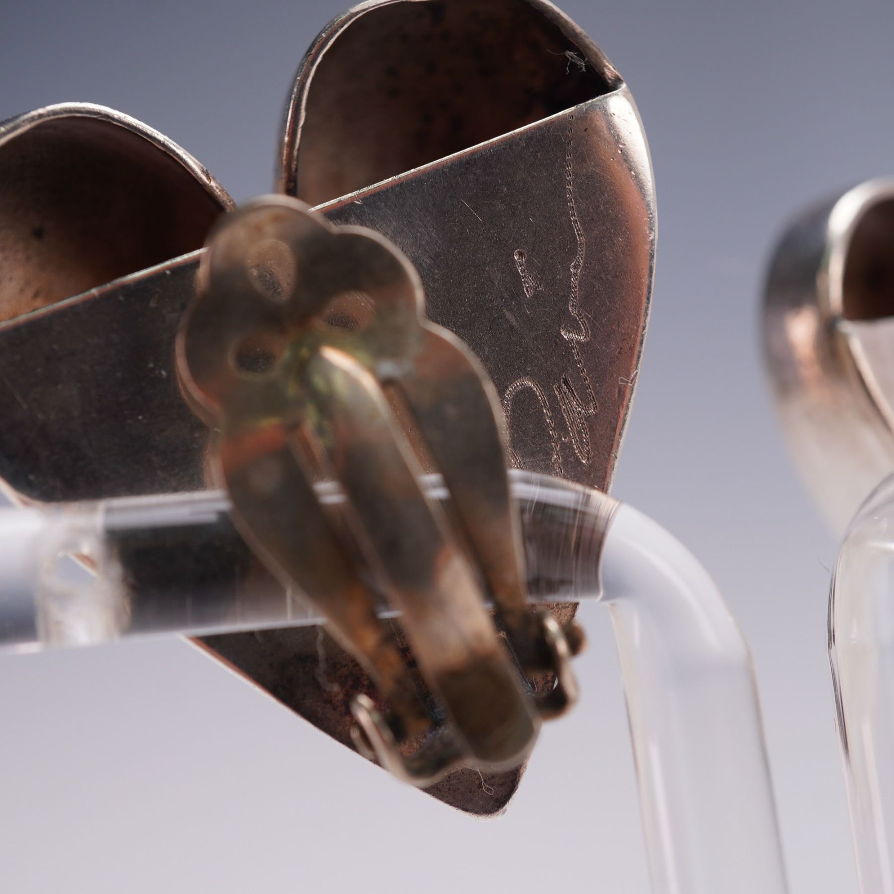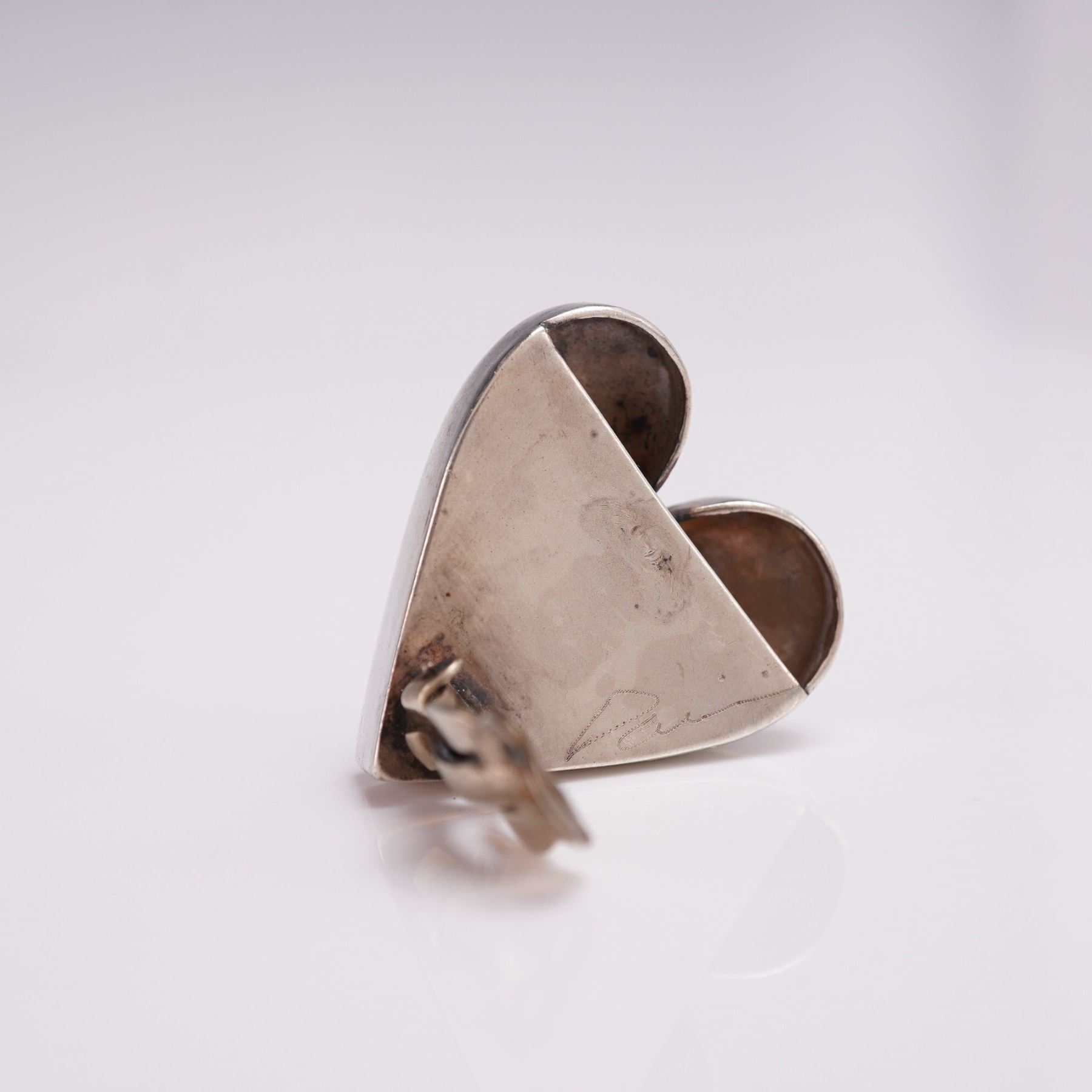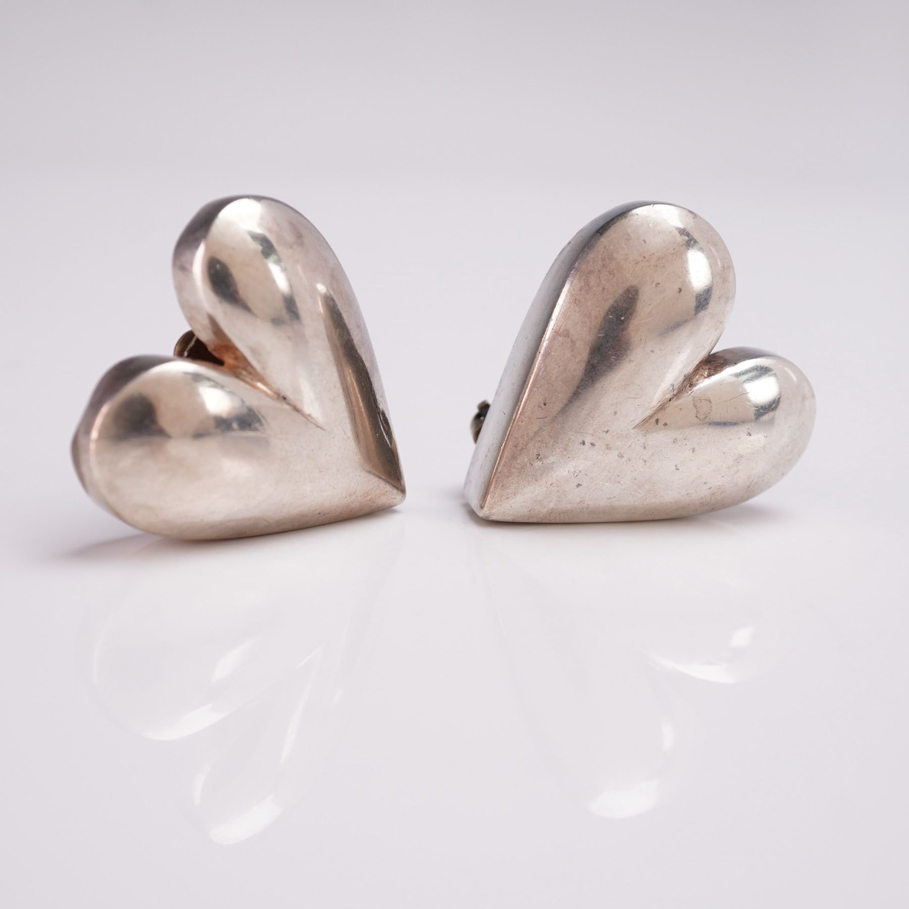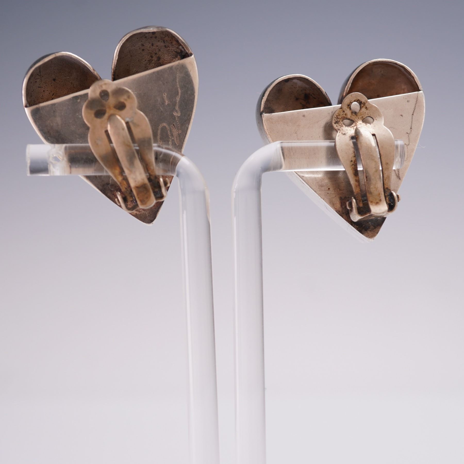One pair of heart-shaped clip-on earrings in sterling silver, artist signed on reverse. Dimensional and highly polished with bold, modernist styling. Total weight over 23g. Measures approx. 1.25"H.