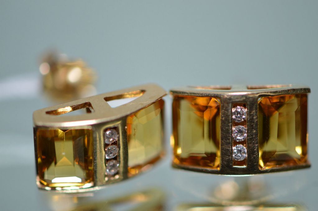 One pair of lady's 14kt yellow gold, citrine quartz and diamond earrings set with 0.06ct of channel set diamonds and 3.48ct in four channel set rectangular citrine quartz gemstones. Retail replacement value $639.00