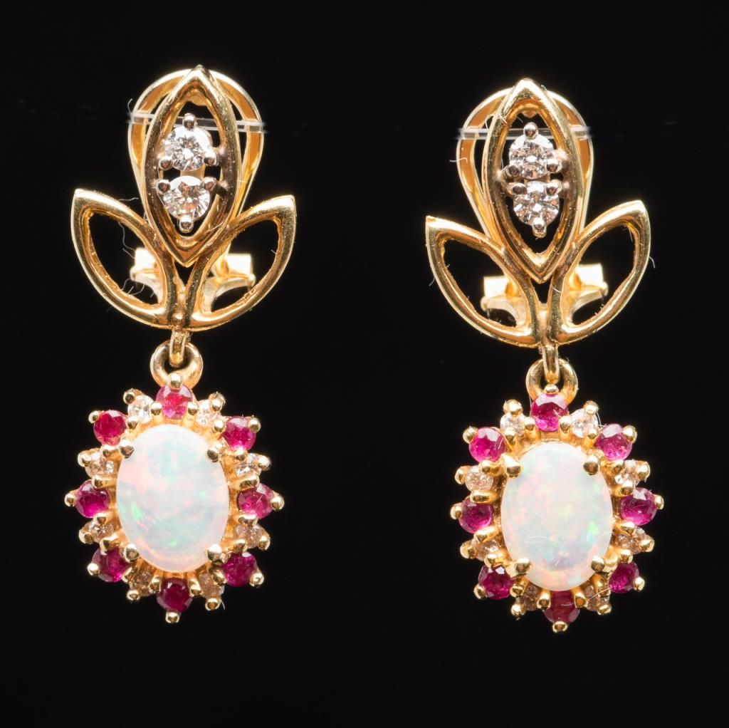One pair of vintage earrings set with 2 fine quality opals surrounded by rubies and diamonds. Est.: $1,000 - $1,250