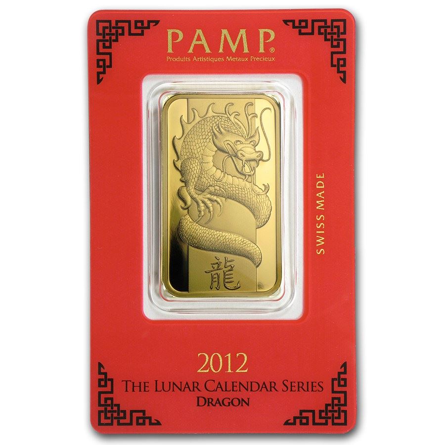 One pc. 1 oz .9999 Fine Gold Bar - PAMP Suisse Year of the Dragon In Assay