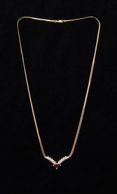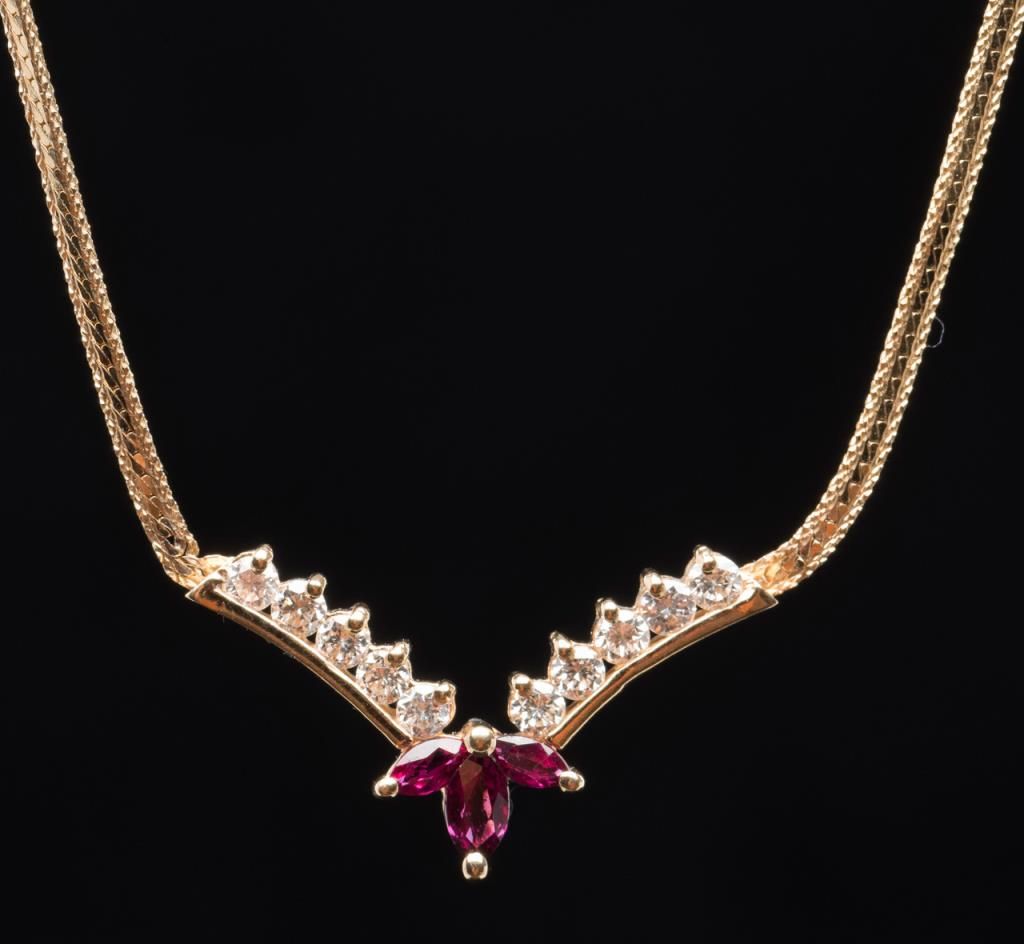 One ruby and diamond necklace containing 3 marquee rubies and 10 diamonds weighing approx 0.40ct. Est.: $500 - $600