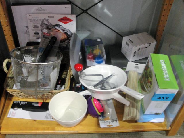 One shelf lot of assorted new kitchen tools and