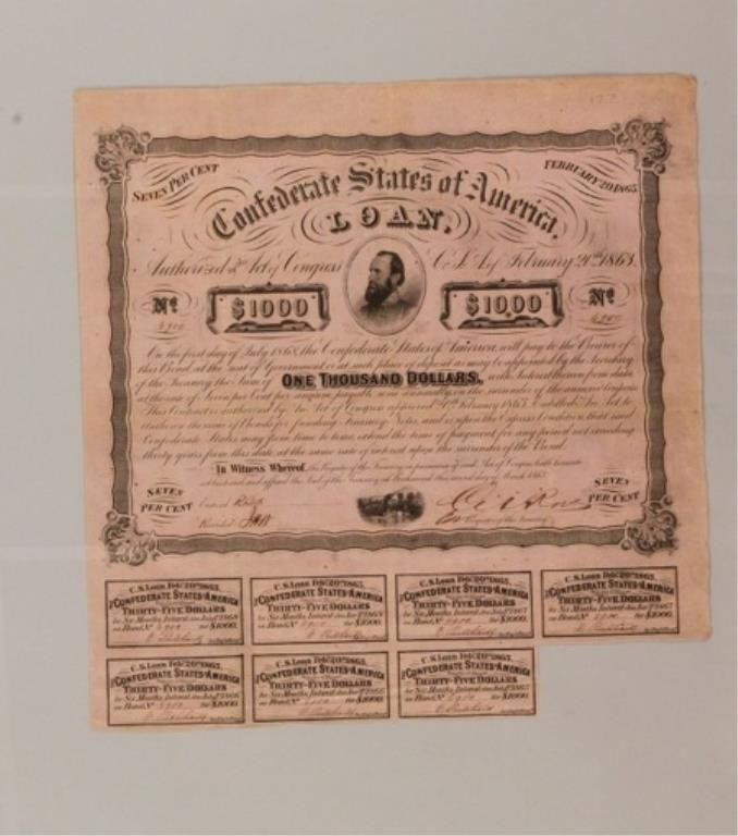 One thousand dollar eight percent CSA loan certificate, issued Richmond 1863, no. 4900. Total of 7 $35 coupons attached. Some creasing and scattered foxing. 13 3/4" x 14".