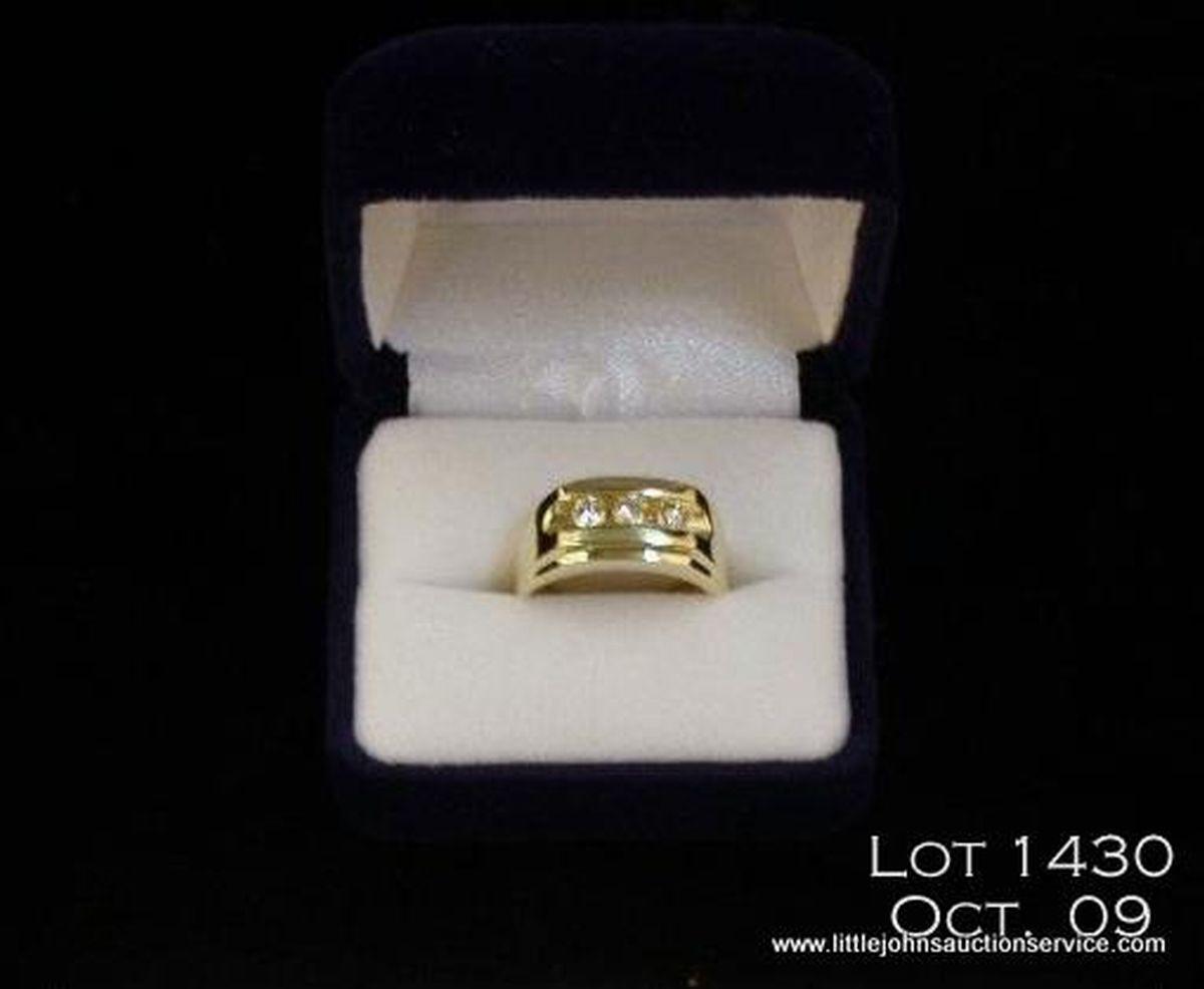 One three diamond mans ring made in 14 k yellow gold and set with 3 diamonds weighing 0.22 ct. Est. $500 - $1,000
