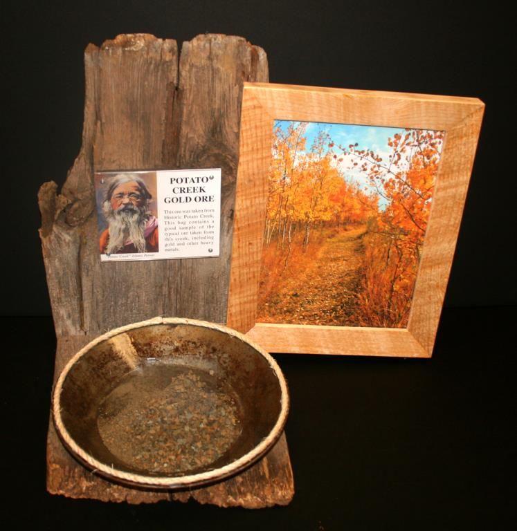 Creek, donated by Fillmore & Co. Lodge & Cabin Rentals, along with Potato Creek Gold Ore, displayed in a vintage gold pan on a decorative shelf. Package includes a framed nature photo from Black Hills Photographer, Chelsie Bauer."