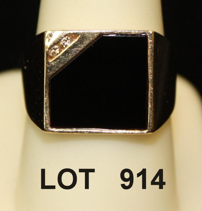 One unique style mans ring set with custom cut onyx and 2 diamonds in 14kt yellow gold, approx wt 4.66 gms. Est.: $400-800.