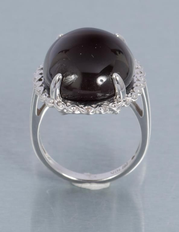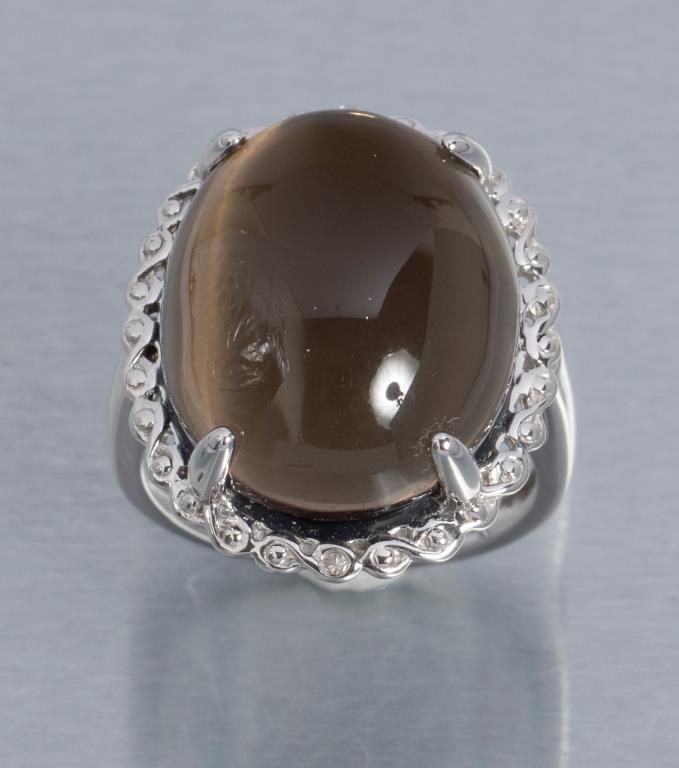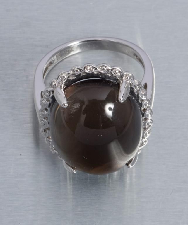 One white gold ring set with a large Smokey topaz cabochon weighing approx. 30.00 cts. Est.: $300 - $350