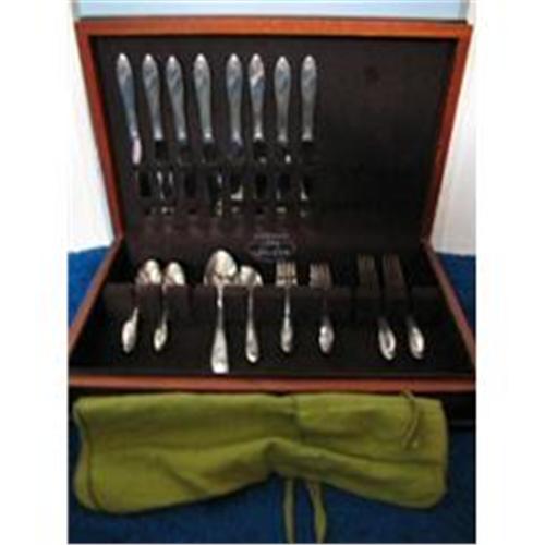 This service for eight Oneida Community Tudor Plate flatware set in the Queen Bess pattern was made by Oneida LTD. in 1946. The set contains 36 pieces in all, 8-hollow knives with stainless steel blades(9 1/2 inches), 8-dinner forks(7 1/2 inches), 8-salad forks(6 1/2 inches), 8-teaspoons(6 inches), 1-sugar spoon(6 inches), 2-table serving spoons(8 1/4inches) and 1-butter spreader(6 1/4inches). The pieces are marked Oneida Community/Tudor Plate while the label in the chest is marked: Made by Gorham with Pacific Silver Cloth/Prevents Tarnish. The silverware does show some scratching from age and use, but all in all is in very good + condition and the outside of the box apparently has been neglected for a long time as their are knicks and chips in the wood and is in need of a good scratch cover polishing. I will not mess with the box at all, but if buyer wants to preserve the beauty of the box, spray it with a sealer to seal in all the chippiness and keep it from chipping any more. A wonderful addition to any Holiday Table Setting or Oneida LTD. Collection. <BR>SH & Ins. will be quoted after orders placed. If you have questions feel free to contact me and thank you for looking.