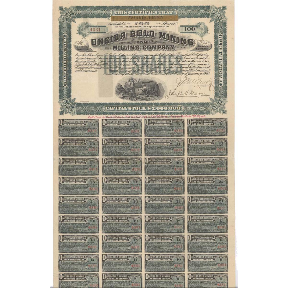 1900, California. Stock certificate for 100 shares. Green/Black. Vignette at bottom center of miners at work. Coupons attached at bottom. Uncancelled and fine.