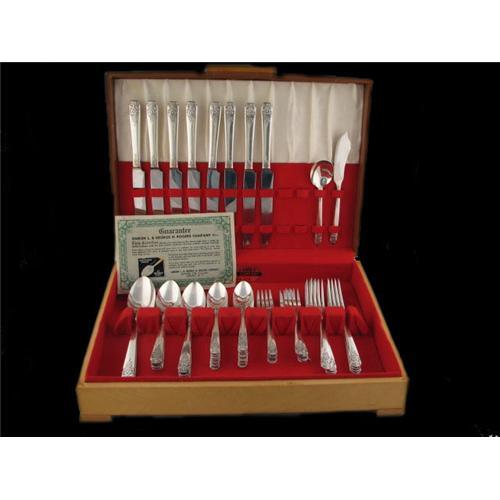 This is the Margate pattern by Oneida, Simon L. & George H. Rogers Company introduced in 1938. It is a complete service for 8 that includes 8 each of the knives, dinner forks, salad forks and tablespoons, 16 teaspoons, 3 serving spoons, a butter knife and sugar spoon. This set comes in its original anti-tarnish case and with the guarantee certificate from Simon and Rogers. The top of the case is in poor condition along the corners. The flatware is in gently used very nice condition.