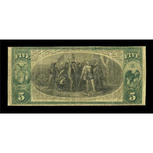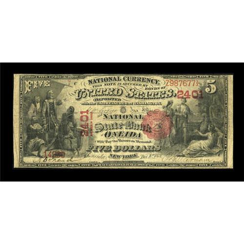 <B>Oneida, NY</B></I> - $5 1875 Fr. 404 <B>The National State Bank</B></I> Ch. # 2401<BR> The census stands at a paltry 8 large for this bank that we last had available five years ago. This $5 exhibits even circulation and nice edges. The cashier's signature is a little bolder than the president's. <B>Fine</B></I>.<BR><BR><b>Shipping:</b> Coins & Currency (<a target="_blank" href="http://www.heritageauctions.com/common/shipping.php">view shipping information</a>)