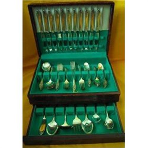 This service for twelve Community Silverplate flatware set in the Evening Star pattern was made by Oneida LTD. 1950-1961. It comes with all the serving pieces. The set contains 77 pieces in all, 12-hollow knives(9 1/4 inches), 12-dinner forks(7 5/8 inches), 12-salad forks(6 5/8 inches), 23-teaspoons(6 1/8 inches), 12-round bowl soup spoons(7 inches), 1-sugar spoon(6 1/4 inches), 1-pierced table serving spoon(8 3/8 inches), 1-medium solid cold meat fork(8 1/2 inches), 1-solid piece gravy ladle(7 1/8 inches), 1-butter spreader(6 15/16 inches) and 1-tablespoon serving spoon(8 3/8 inches). The pieces are marked Community while the label in the chest is marked: Tested and Approved Anti-Tarnish By Oneida LTD. Silversmiths Laboratories. The silverware does show some scratching from age and use, but all in all is in very good + condition and the outside of the box apparently has been neglected for a long time as their are knicks and chips in the wood and is in need of a good scratch cover polishing. I will not mess with the box at all, but if buyer wants to preserve the beauty of the box, spray it with a sealer to seal in all the chippiness and keep it from chipping any more. A wonderful addition to any Holiday Table Setting or Oneida LTD. Collection. <BR>SH & Ins. will be quoted after orders placed. If you have questions feel free to contact me and thank you for looking.