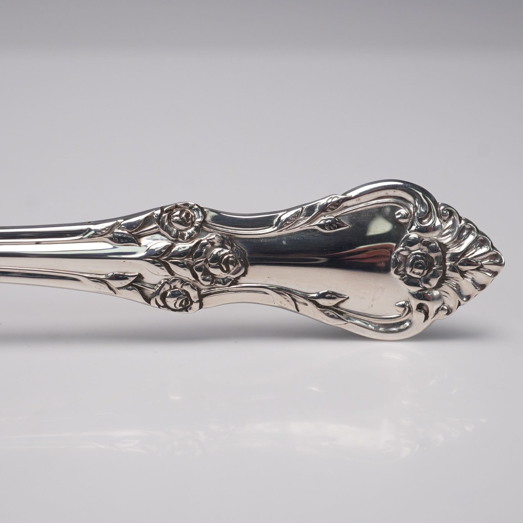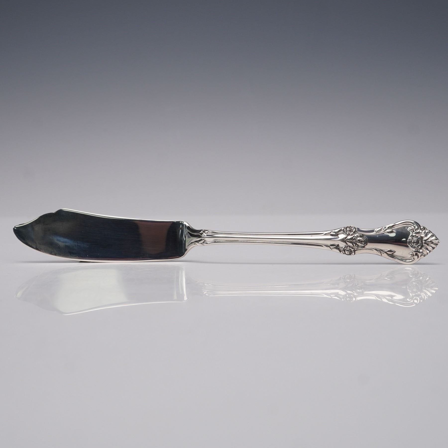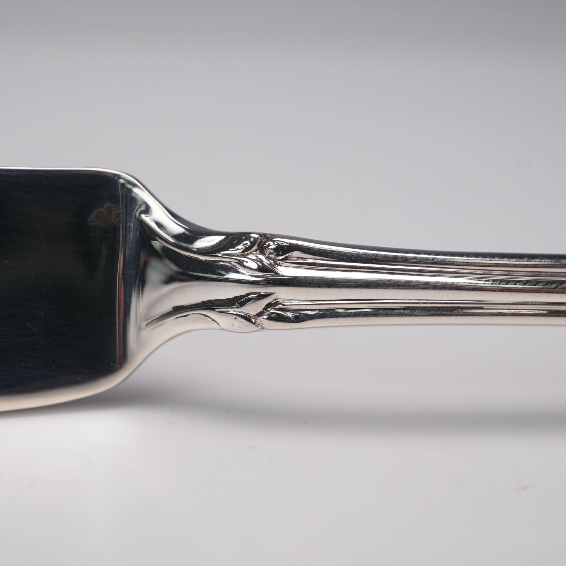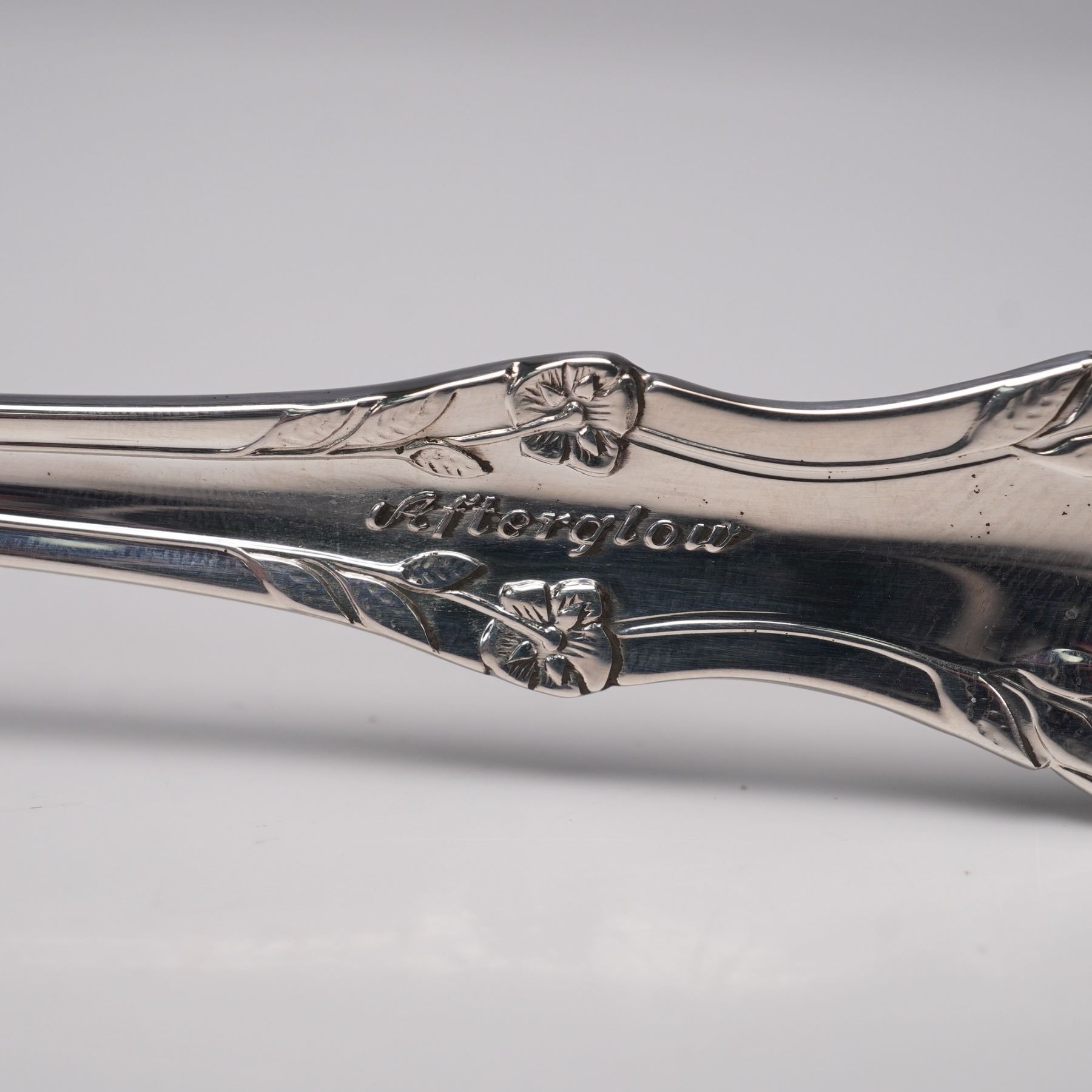 A stylish master butter knife in the "Afterglow" pattern. The knife, distinguished by an elegantly tapered handle adorned with finely cast floral motifs in high relief, seamlessly integrating botanical scrollwork with a flared terminal. Inscribed "Afterglow". Oneida Sterling hallmarked. Net silver 1.02 troy oz.