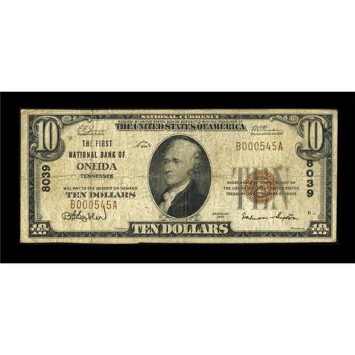 <B>Oneida, TN</B></I> - $10 1929 Ty. 1 <B>The First NB</B></I> Ch. # 8039<BR> A very scarce note from the only bank to issue in this small NE Tennessee community, with our records disclosing only eight offerings of any kind from here during the past sixty years. <B>Very Good+.</B></I> <BR><BR><b>Shipping:</b> Coins & Currency (<a target="_blank" href="http://www.heritageauctions.com/common/shipping.php">view shipping information</a>)