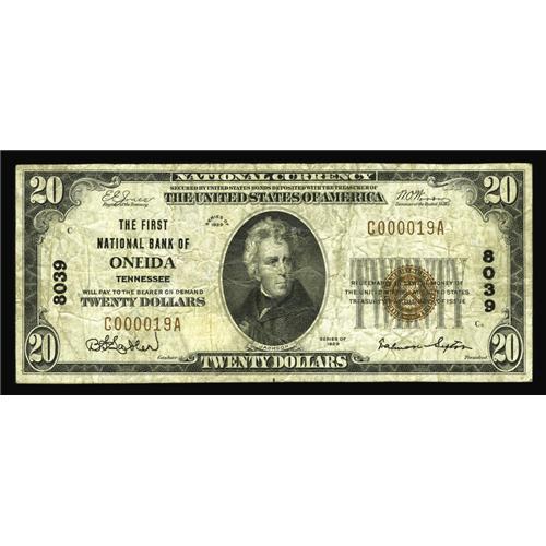 <B>Oneida, TN</B></I> - $20 1929 Ty. 1 <B>The First NB</B></I> Ch. # 8039<BR>A scarcer note from the only issuer in this small town. <B>Fine.</B></I>