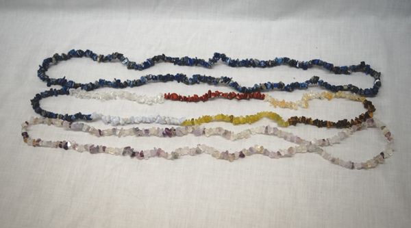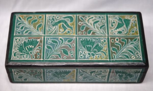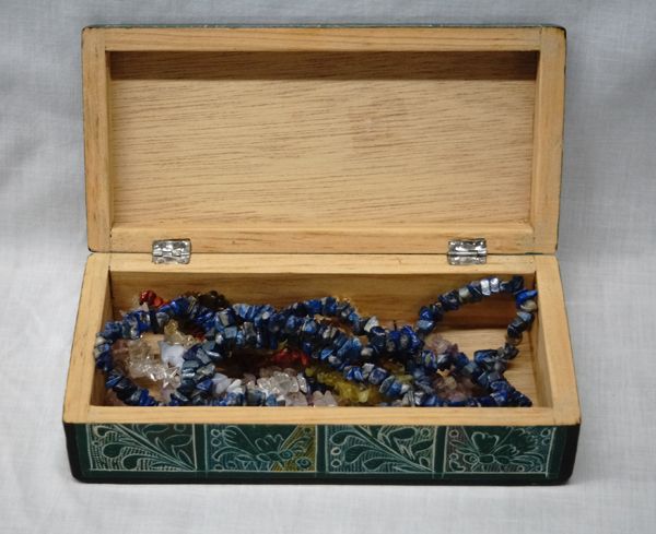 Oninala Mexico Incised Lacquered Hinged Box + Necklaces, box measures 8''L x 3.75''W x 2.5''H, included are 3 stone chip necklaces ranging in length from 30-34'', stones are Fluorite, Sodalite, and Mixed Stones