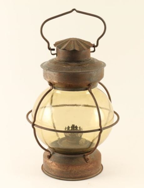 Metal construction with gold glass 'onion bulb' center. Approx 9 1/2" h x 5 1/2" dia. nice aged patina, perfect for decor.