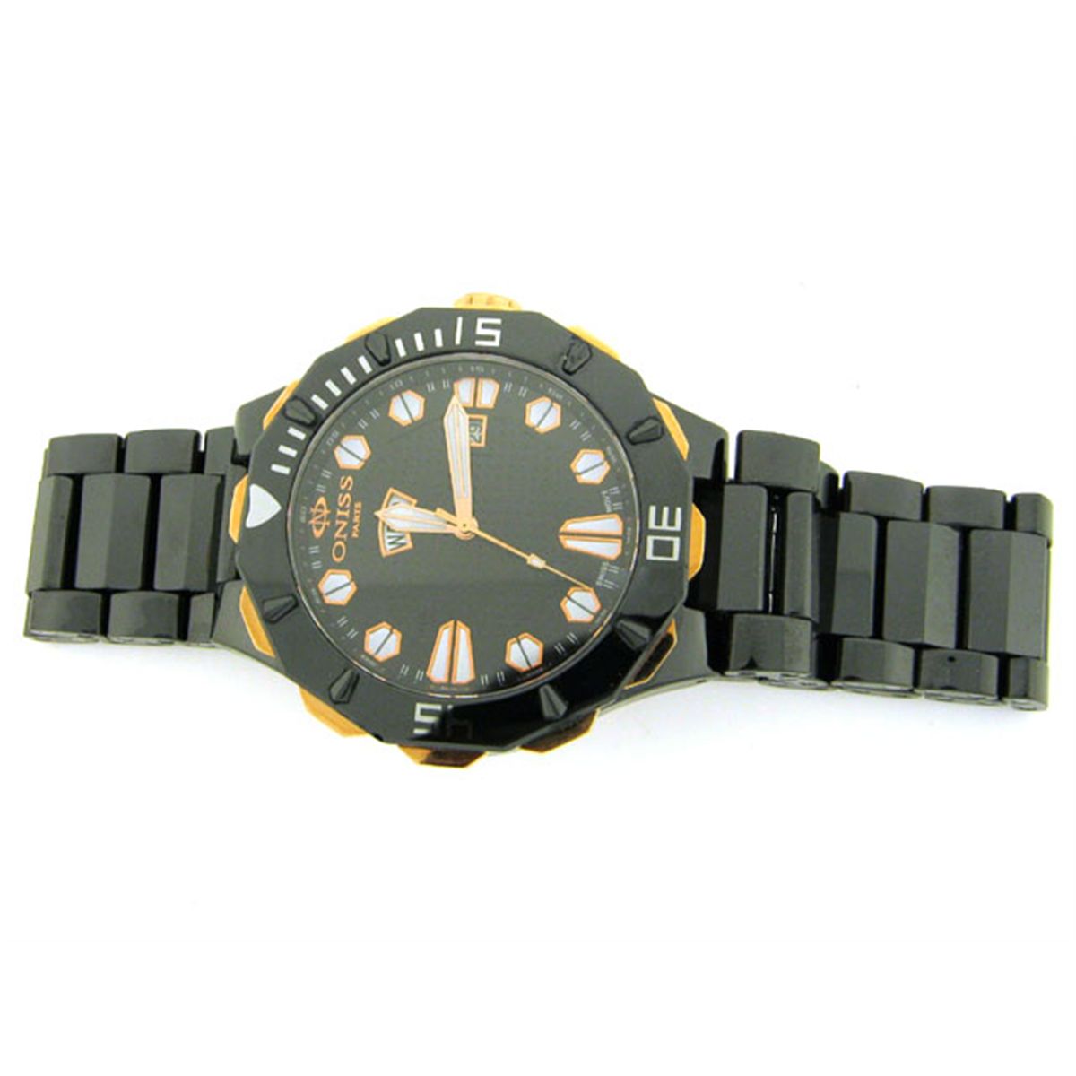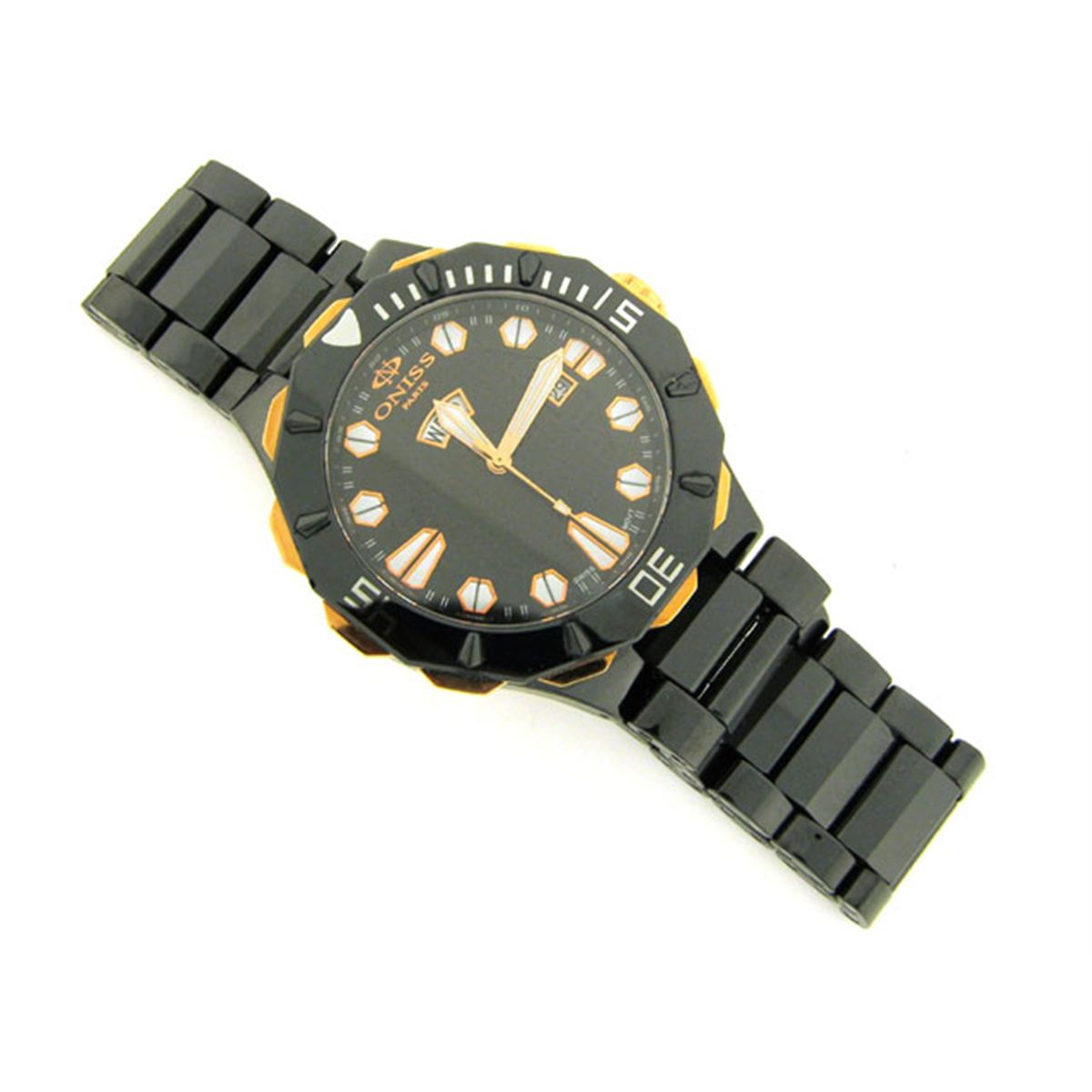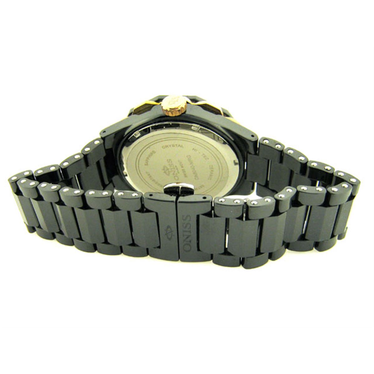 This is an Oniss #ON8040-MRG1 Men's Rose Gold Trim Sol Black Ceramic Watch with the following features: Swiss Quartz Movement; Ceramic Case and Band; Push Button Butterfly Deployment Clasp; Sapphire Crystal; Day/Date Display, Luminous Hands and Markers; Case diameter is 46; Case thickness is 12mm; Water Resistant - 50M; and Screw Down Case back.