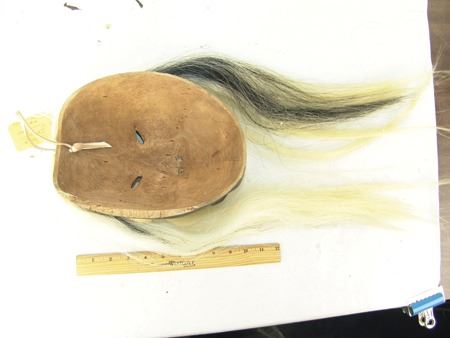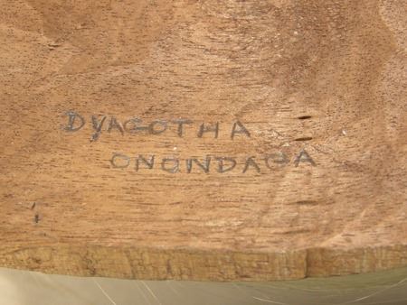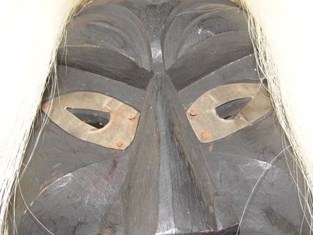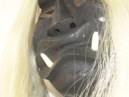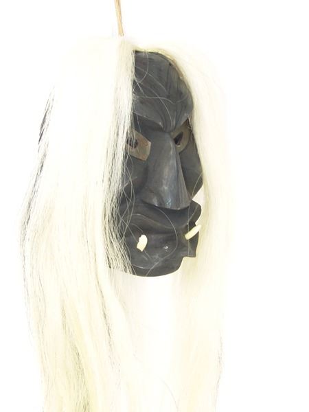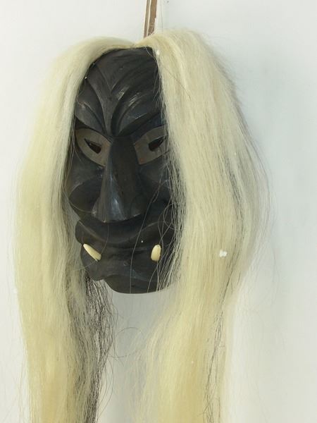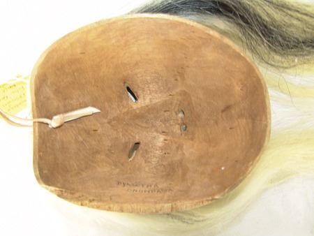 Late 1900s, Traditional hand carved and painted Onandega false face mask with copper clad eyes and protruding teeth; labeled "DYACOTHA." 10" x 7" x 5" plus hair